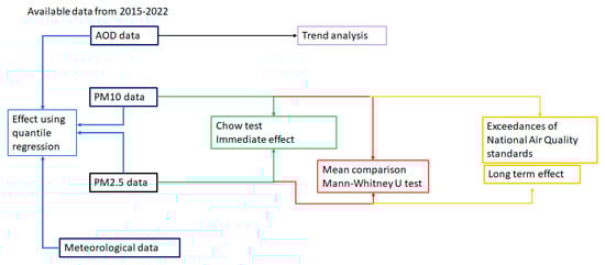 The methodology of this study is depicted in Figure 2. The statistical significance of the differences in PM concentrations using monthly data was assessed using the non-parametric Mann–Whitney U test, which is frequently used in air quality studies comparing differences in pollutant levels [,]. A significance level of 95% (p < 0.05) was used. Finally, the effect of an abrupt change on anthropogenic sources of air pollution in yearly concentrations was determined using the number of days exceeding the national standard for air quality. In Mexico City, lockdown restrictions were the abrupt change, whereas in Monterrey, it was the drought, causing dust, and in Guadalajara, wildfires caused abrupt changes in sources of air pollution.