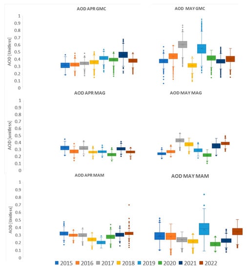 AOD (dimensionless) in GMC, MAG, and MTY in April and May 2015–2022.