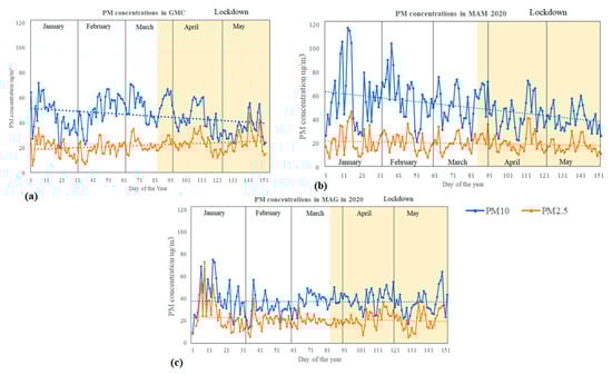 PM concentrations at (a) GMC, (b) MTY, and (c) MAG from 1 January to 31 May 2020. The lockdown period is marked in yellow (from 23 March 2020, DOY 83).