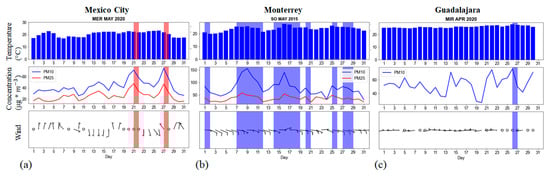 Representative meteograms showing the relations between wind speed and PM at stations in (a) Mexico City, (b) Monterrey, and (c) Guadalajara. Red bars show days that the PM2.5 limit was exceeded, and blue bars show exceedance of the PM10 limit. In the figure, PM10 is represented by a blue line and PM2.5 by a red line. The wind speed and direction are shown in the bottom of each panel.