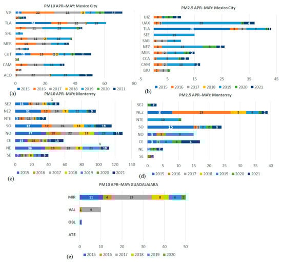 Number of days that exceeded the PM10 and PM2.5 limits in Mexico City (a,b). Number of days that exceeded the PM10 and PM2.5 limits in Monterrey (c,d). Number of days that exceeded the PM10 limits in Guadalajara (e). In all cases, the period is April and May 2015–2021.