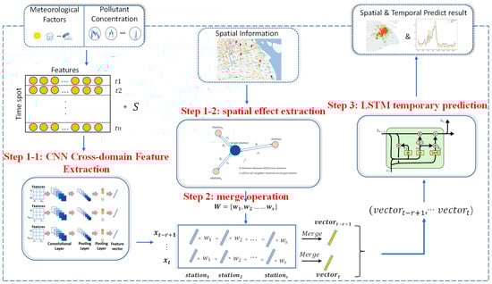 In this study, we propose a hybrid deep learning (HDL) framework (termed as HDL-learning) based on CNN-LSTM to improve the prediction of the intra-urban PM2.5 concentration (Figure 1). The framework differs from previous studies in that, firstly, a two-dimensional CNN (2D-CNN) was applied to matrices with dimensions of data types and time series for a given station to extract nonlinear correlations of the cross-domain information and timing patterns. Subsequently, a Gaussian function was incorporated to extract the distance-based correlation of air pollutant concentrations from the given station and other stations. Finally, LSTM was designed to fully analyze and extract the long-term historical features of the input time series data to yield time series prediction data. We tested the efficiency and validity of our proposed method in the megacity of Shanghai.