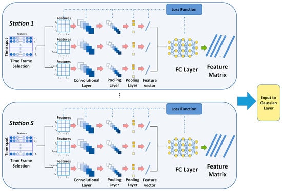 For the ability to extract data features, we use it to extract temporal features and cross-domain features for each station. We pre-set a time window of length . For each moment in a time span of length , m-dimensional data containing air quality and meteorological information in a time period of length centered at moment are extracted. In other words, at each moment in time in a single station, we obtain a matrix of representing the temporal and cross-domain features. Those matrixes are input into CNN for feature extraction. After convolution and pooling layers the extracted features were flattened into a 1-D array. Finally, the feature map containing the meteorological and air pollutant information of each station in every time spot was generated through the fully connected output layers, and the above steps were then applied to all stations. The structure diagram of this part is shown in Figure 3.