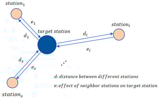 s one-dimensional vectors were outputted during the time period () to calculate the effective weights for each station based on its distance between target stations. The Gaussian function has the special feature that the weight is 1 when the distance between two points is the shortest among all neighbors, and tends to 0 as the distance increases. The effective weights are calculated as Equations (2) and (3).