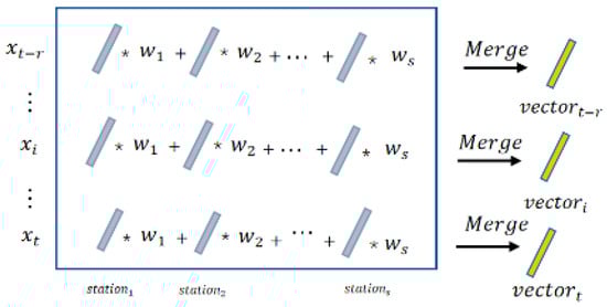 where is the geographical distance between station and the target station. The merging operation process is shown in Figure 5. In this operation, for each moment, the feature vectors of each station around the target station are multiplied and summed by the corresponding weights to obtain the merged vector. The fused vectors are then fed into the LSTM for temporal prediction.
