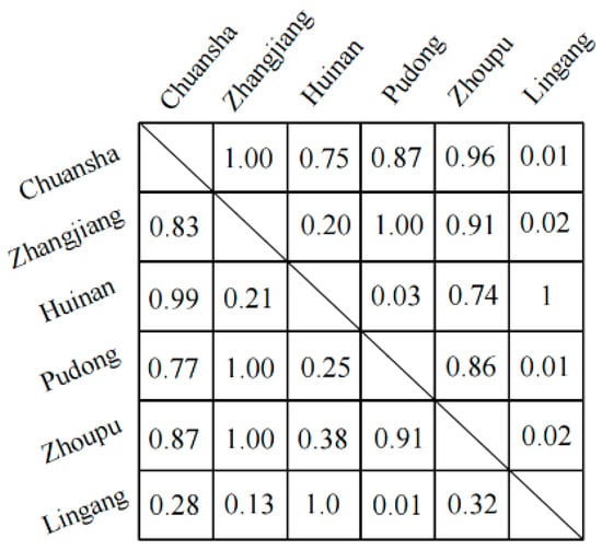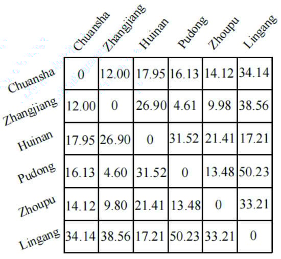 Next, the Gaussian function was added in the calculation of the effective degree of each neighbor station based on distance. The distance matrix and weight matrix is indicated in Figure 8 and Figure 9.