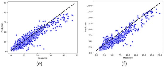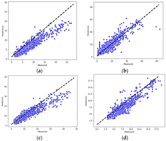 The actual versus predicted values of the model in the form of a scatter plot are shown in Figure 10. The plots show that most of the data points are close to the regression line and have remarkably high correlation values, indicating the good fit of our model. Therefore, the extraction of features by CNN networks and the practice of Gaussian functions to handle geolocation information are reasonable in this work.