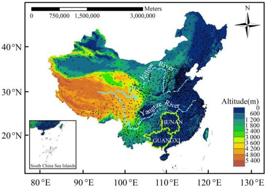 The illustration of the research area and the location of weather stations (black dots).