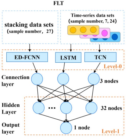 In order to reduce the variance of a single neural network model, in this study, as shown in the Figure 2, the ensemble learning FLT model is proposed, which consisted of ED-FCNN, LSTM and TCN by using a stacking approach. The first level of ensemble learning takes the ED-FCNN, LSTM and TCN as the Level-0 models, and the second level uses the fully connected neural network (FCNN) as the Level-1. The FCNN is selected in this paper as the Level-1 model because the FCNN has the characteristics of multiple inputs, so it can process multiple neural networks in the Level-0 sub-network, and then learn how to best integrate the predictions from each sub-neural network model, and it allows the stacked ensemble model to be regarded as a single large model. Figure 3 is the flow chart of this study.