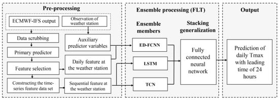 Recently, several researchers have attempted to improve the performance of the forecasting by combination (i.e., ensemble) of the diversified machine learning [,,]. The random forest, support vector regression and ANN, as well as the multiple-model ensemble (MME) were employed to improve the forecast bias of daily maximum temperature in Seoul from the Local Data Assimilation and Prediction System model outputs []. Chen et al. [] applied linear regression models to integrate the ANN and the long short-term memory-full convolutional network (LSTM-FCN) to reduce prediction bias of 2-m temperature at 301 weather stations in mainland China. These experiments have all demonstrated that combining different machine learning models can improve the forecast performance by overcoming the drawbacks of each individual classifier. However, the complexity of the neural networks used in these studies was limited, and the ensemble methods used were relatively simple.