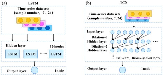 Architectures of the sub-neural network model in an ensemble neural network (a) long short-term memory (LSTM) and (b) temporal convolutional network (TCN).