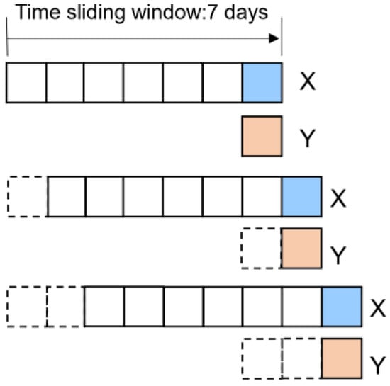 For LSTM and TCN constructed in this study, the time-series data set with a fixed form should be constructed as the model input, and the shape of the input array includes the batch size, time-series length and feature number. The steps of constructing the time-series data set are as follows. Firstly, the feature factors for the time-series data set are selected. Considering the structural features of LSTM and TCN, the input feature factors are numbered 1 to 24 in Table 2, which are forecast factors, time lagged variables and the longitude, latitude and altitude of the meteorological stations. Secondly, a time sliding window is applied to all time series (all features) at each station, and a number of batch samples with consistent length of time series will be generated by the time sliding window segmentation technique. Then, the batch samples generated at each station are connected to form the final data set. Among them, the setting of the time sliding window for the segmentation of time-series data is shown in Figure 2. For the feature data set (X in Figure 5), the length of the sliding window is set to 7 days, and after the sliding, the shape of the feature data samples in the training set is obtained as (1712 × 2238, 7, 24), where 1712 is the number of sequences generated at a single station after the time sliding window, and 2238 is the total number of stations. For the target data set (Y in Figure 5), the time-series length is set to 1, the day-by-day sliding is applied through the sliding window, and the shape of the target data sample is (1712 × 2238, 1, 1). So far, the feature data set and the target data set have achieved one-to-one correspondence on each batch. After completing the data set construction, the data set can be directly input into the LSTM and TCN.