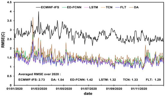Compared with the ECMWF-IFS and DA, the neural network models of ED-FCNN, LSTM, TCN and FLT, increase the proportion of stations with the RMSE between 1.0 °C and 1.5 °C from 52.37% of DA model and 13.67% of ECMWF-IFS to 69.53%, 79.00%, 77.35% and 79.94% respectively. Especially in the area south of the middle and lower reaches of the Yangtze River (See Figure 1 for the location), the RMSEs of most stations of the DA model are between 1.5 °C and 2.0 °C, while the RMSEs of all neural network models in this area are between 1.0 °C and 1.5 °C.