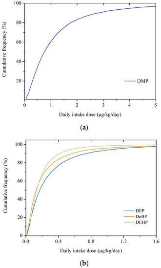 Cumulative frequency distribution of exposure to phthalates in dormitories. (a) DMP; (b) Other phthalates.