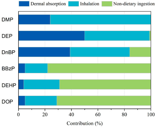 The contributions of each pathway to total exposure were also calculated. As shown in Figure 2, exposures via inhalation and dermal absorption mainly contributed to the total exposures for DMP, DEP, and DnBP (with ranges of 45–76% and 24–50%, respectively). Non-dietary exposure via dust ingestion was a predominant pathway for BBzP, DEHP, and DOP (roughly 70–80%).