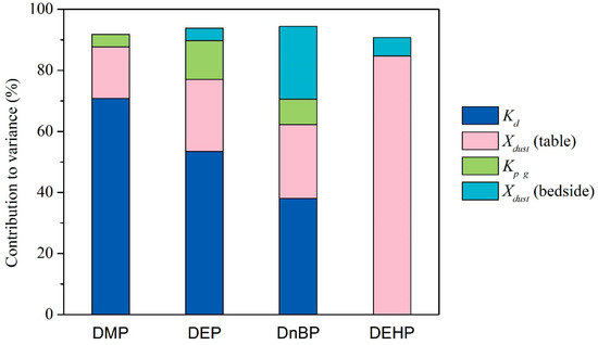 The sensitivity of input parameters to modeled daily intakes in university dormitories was analyzed for targeted phthalates (except for BBzP and DOP). As shown in Figure 3, the dust-air partitioning coefficient, dust-phase concentration, and transdermal coefficient (Kp_g) were found to be the major parameters. For DMP and DEP, the variations of the dust-air partitioning coefficient and dust-phase concentration of table dust contributed roughly 80–90% of the total variance. For DnBP, the dust-air partitioning coefficient and dust-phase concentrations (including both bedside and table dust) were predominant contributors. For DEHP, the phthalate level in the table dust was the most predominant input parameter (with a contribution of 85%) since dust ingestion was the most important exposure pathway during daily activities.