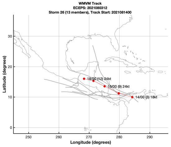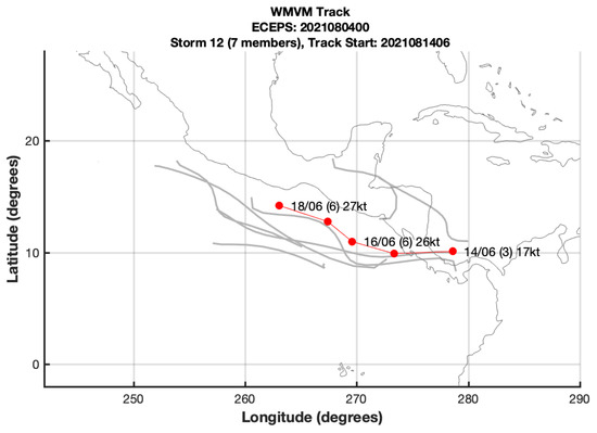 ECEPS WMVM track forecast as in Figure 2, except from 00 UTC 4 August 2021 for Storm 12 that starts in the southern Caribbean but moves across Central America and becomes an ENP tropical cyclone.