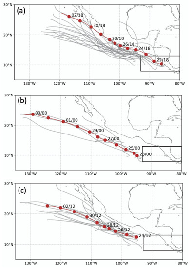 Selections and non-selections of the ECEPS Storms as in Table 1 and Table A1 for Pre-Enrique, except for Pre-Guillermo.