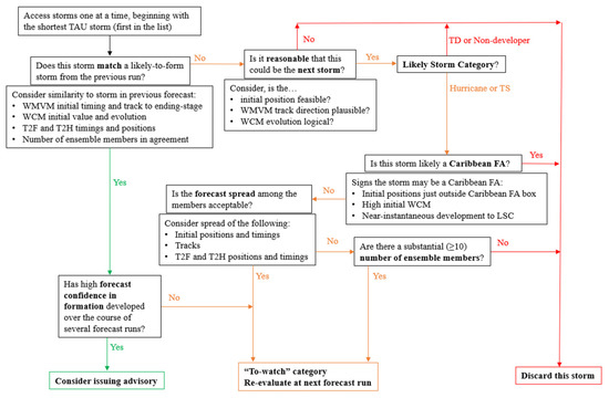 If the forecast is reasonable and the LSC is Hurricane or TS, the forecaster should immediately check whether the storm may be a Caribbean FA (Figure 5, middle-right decision box). The following are signs that an ensemble storm may be a Caribbean FA: the initial positions of a few or most of the ensemble members are just outside the established Caribbean FA box; there is too high initial WCM to be reasonable for a new ensemble storm, and the WCM indicates near-instantaneous development to the LSC of Hurricane or TS. If these signs are present and the storm is strongly suspected to be a Caribbean FA, the decision is to discard the storm.