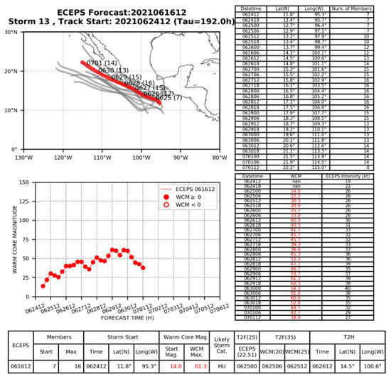 The major advance of the Elsberry et al. [1] study was the documentation of the fact that the ECEPS was also able to predict the TEHU and TETS times and positions along these 15-day ECEPS Weighted Mean Vector Motion (WMVM) track forecasts. It is important to note that in the WMVM calculation, the largest (smallest) weight is given to the ensemble member motion vector that is closest to (farthest from) the most recent 12-h WMVM vector. Those same Elsberry et al. [1] track weighting factors are utilized to give the largest weight in the weighted-mean Warm Core Magnitude (WCM) calculation along that WMVM track forecast. Elsberry et al. [1] had found that the appropriate ECEPS-predicted WCM threshold values for the ENP storm intensities were: Maximum WCM < 25.0 (or 20.0 if weak) for Tropical Depression; 25.0 < WCM < 37.0 for Tropical Storm, and WCM > 37.0 for Hurricane.