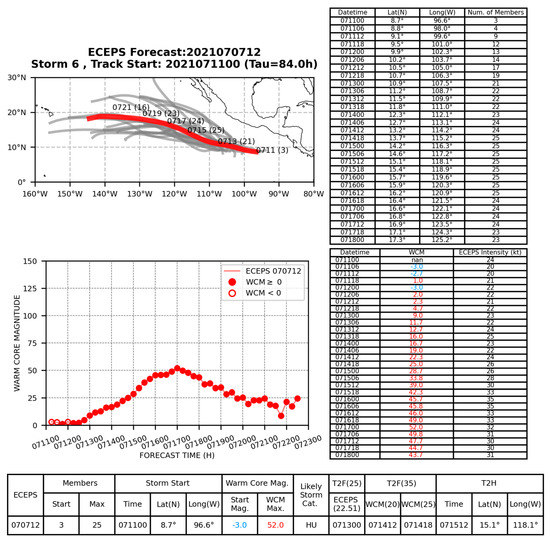 ECEPS WMVM track forecast and WCM evolution as in Figure 6, except from 12 UTC 7 July Storm 6 that was selected for Pre-Felicia as a match for the 00 UTC 7 July selection.