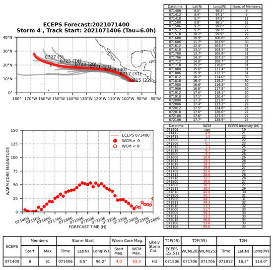 ECEPS WMVM track forecast and WCM evolution as in Figure 6, except from 00 UTC 14 July for Storm 4 that was selected for Pre-Guillermo.