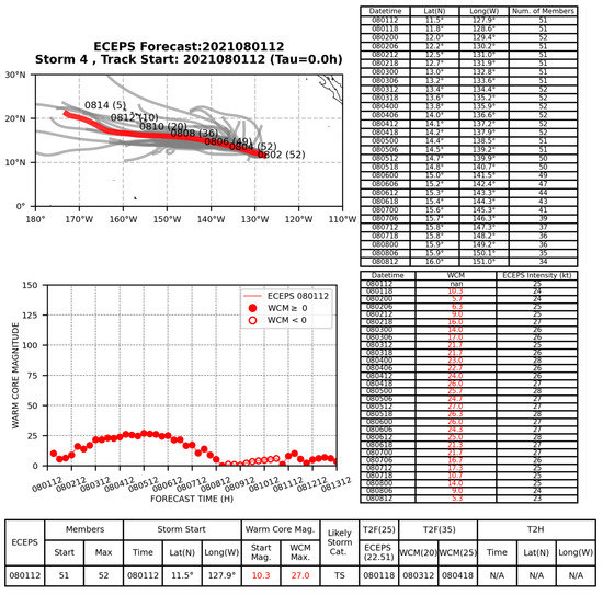 Capalbo [4] provides a summary validation table for the ECEPS forecasts of pre-Jimena. As indicated above, the first detection in the ECEPS forecast from 00 UTC 31 July is at almost the same time as the first NHC Advisory for Jimena (i.e., about six days in advance of the Jimena T2TS of 06 UTC 5 August). The two ECEPS forecasts on 31 July had very early predictions of the T2TS with timing errors of (early) 72 h and 102 h (Table A4, column 2). Whereas the first of these two forecasts incorrectly predicted that pre-Jimena would become a Hurricane 30 h after the T2TS, the second forecast had only a peak WCM forecast of 32.7, which corresponds to a strong TS. Capalbo [4] notes that from the second ECEPS forecast until the last forecast at 12 UTC 5 August when Jimena became a TS, there was only one other forecast (12 UTC 2 August) that predicted a strong TS. Instead, three forecasts had peak forecast WCM values just over the larger WCM threshold of 25.0, and five were just over the lower WCM threshold of 20.0. Due to these highly accurate WCM predictions, the T2TS timing errors were also accurate with six of the seven forecasts from 00 UTC 2 August to 00 UTC 5 August having timing errors of either the exact time or early by 12 h (Table A4, column 2). With these accurate T2F (35) timing errors, and accurate WMVM track forecasts, the T2TS position errors were very small for those six out of seven ECEPS forecasts from 00 UTC 2 August to 00 UTC 5 August, which was important since the WMVM track forecasts were toward the Hawaiian Islands (Figure 9). Furthermore, the capability of the ECEPS-predicted WCM to indicate that pre-Jimena would remain a weak TS is important for avoiding unnecessary disaster preparedness activities in Hawaii.