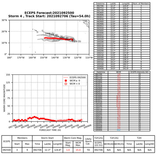 The second application of the decision flowchart is to guide the forecaster in non-selection among the many storm options provided by the 51-member ECEPS. Capalbo [4] describes this application of the decision flowchart for the three alternate storm option (storm 9, 11, and 12) to the selection of storm 13 from the 12 UTC 16 June ECEPS forecast. For example, storm 9 in Table 1 was non-selected because it is a subtropical cyclone and the ECEPS-predicted WCM evolution indicated it is a cold-core system. Since during the 2021 season none of these cold-core systems developed into a ENP TC, a decision has been made to eliminate all cold-core systems in the step 3 of Table 1. Consequently, the forecaster will not be presented any cold-core Storms for evaluation, which will make the decision flowchart procedure more efficient.