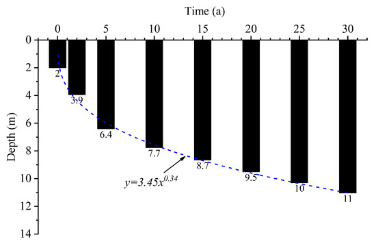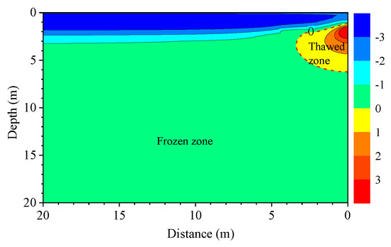 - The buried pipeline would cause significant disturbance to the temperature field around it, characterized by isotherm shape changing, permafrost table deepening, seasonal frost penetration decreasing, and resultant thaw bulb expanding. In the 10–15 years after pipeline construction, the thawing front beneath the pipeline extended to the weathered granite layer, which had a small deformation after thaw and warming. The permafrost table depth beneath the center of the pipeline increased in the form of a power function as the operation time of the pipeline increased.
