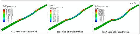 - Pipeline settlement increased with the thawing of foundation permafrost and then kept almost unchanged when the thawing front entered into the weathered granite. Differential settlement of degrading permafrost would cause oval-shaped high-stress areas on the buried pipeline near the interface of strong and weak thaw settlement zones. When the length ratio of strong and weak thaw settlement zones is 1, the maximum stress of the pipeline with a thickness of 16 mm was approximately 45% of its allowable stress, and the pipeline remained safe for 30 years. We expect that the stress exerted on the pipeline will increase larger than previously estimated, owing mainly to the underestimated permafrost degradation and permafrost-thaw-related movement of soil mass. A fully coupled numerical model of interaction between the pipeline and permafrost thawing needs to be established to evaluate more carefully the structural integrity of the warm pipeline buried in frozen soils.