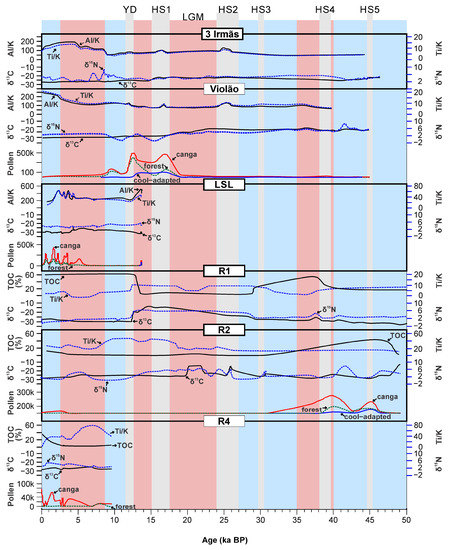 Generalized profile of the geochemical (Al/K and TOC with black line, Ti/K with blue-dashed line), isotopic (δ13C with black line, δ15N with blue dashed line), and pollen (canga vegetation with red line, forest with green dashed line and cool-adapted taxa with blue line) data of active (Três Irmãs, Violão and Serra Leste) and filled (R1, R2, R4, R5, ST02, LB3, LB4 and LTM) lakes. Light blue and red vertical bars represent wet and dry lacustrine phases in the ULs of Carajás [4,13,16,17,26,27]. Divided into 2 parts. YD (Younger Dryas), HS (Heinrich event) and LGM (Last Glacial Maximum).