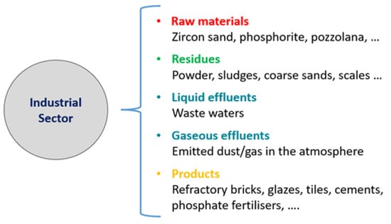 In step 2, the identification of NORM matrices of interest is carried out: the Italian legislation defines “matrix” as “any substance or material that may be contaminated with radioactive materials; this definition includes environmental matrices (including air, water and soil) and food.” Accordingly, raw materials, residues, liquid and gaseous effluents, and final products may be matrices to be considered in the industrial sectors involving NORM. Figure 2 shows a summary of the main categories of matrices of interest. Step 2 is focused on identifying the solid matrices involved in the industrial process and the relevant radionuclide activity concentrations to be measured.