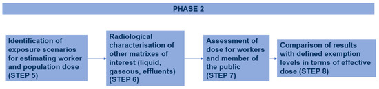 If the radiological content of radionuclides in solid matrices exceeds ELs in terms of activity concentration, the Phase 2 starts. Indeed, in this situation it is necessary to proceed with the assessment of doses to workers and members of the public to be compared with the relevant ELs in terms of effective dose. The four steps of Phase 2 are shown in Figure 3.