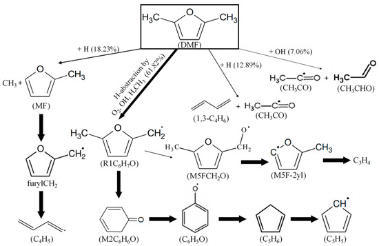 A reaction path analysis of the reduced DMF mechanism at 1200 K and simulation time corresponding to around 20% fuel conversion was conducted in a homogeneous batch reactor for an ignition process of stoichiometric DMF/air mixture at 40 bar pressure, as shown in Figure 1. There are four main consumption pathways of DMF. The primary fuel consumption pathway for DMF is H abstraction reactions initiated by the O2, OH, H and CH3 radicals, producing the methyl group, forming the 5-methyl-2-furanylmethyl radical (R1C6H7O) (~61.82%). Then, R1C6H7O undergoes decomposition reactions, generating cyclopentadienyl (C5H5) and C3H4. A second important pathway of DMF consumption is ipso-addition reactions to yield 2-methylfuran (MF) (~18.23%). Another channel of consumption of DMF (~12.89%) is attacked by the H-atom to form the 1,3-butadiene (C4H6) and acetyl radical (CH3CO). Furthermore, acetylene (C2H2), CH3CO and acetaldehyde (CH3CHO) can be produced via OH addition to the C2 position of DMF.
