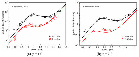 Comparisons between the predicted (lines) and experimental [37,38] (symbols) ignition delays of n-heptane/air mixtures.
