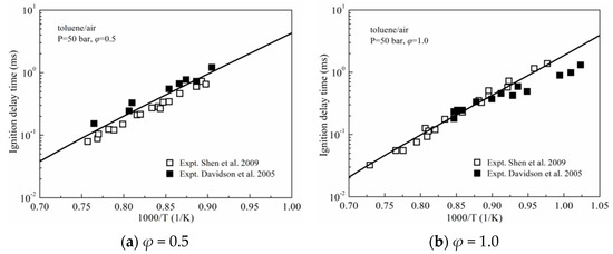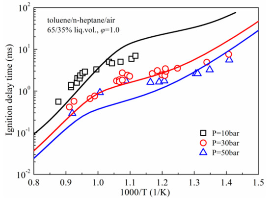 The ignition delays for a stoichiometric mixture consisting of 35% n-heptane and 65% toluene by liquid volume were determined by Herzler and his coworkers [41] in a high-pressure shock tube at pressures of 10, 30 and 50 bar and temperatures of 620–1180 K. Figure 4 depicts comparisons of ignition delay predictions and shock tube experimental results. As shown, both the measured and predicted results reveal that the ignition delays decrease with the increase in pressure. The proposed mechanism can capture the variation trends of the shock tube experimental results, and can also reproduce the measurements reasonably well under different initial pressure conditions with a maximum deviation of two to three times.