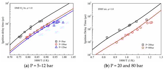 The shock tube experimental data for stoichiometric DMF in argon (Ar)-diluted oxygen mixture at initial pressures of 5–12 bar by Eldeeb and Akih-Kumgeh [42] and the experimental data in a shock tube for DMF/air mixture by Somers et al. [43] at pressures of about 20 and 80 bar and a temperature range of 820–1207 K are taken to assess the proposed mechanism. Figure 5 displays the comparisons between the simulated ignition delays and the measurements. It can be concluded that the ignition delays have an inverse relationship with the pressure. In general, from Figure 5a, the simulated ignition delays obtained by the proposed mechanism satisfied the experimental data at pressures of 5–12 bar. As shown in Figure 5b, the proposed mechanism captures the variation trend of shock tube experimental results at elevated pressures, but a slight discrepancy is observed at temperatures below 850 K; thus, the improvement for the low-temperature chemistry of DMF ought to be carried out sequentially.