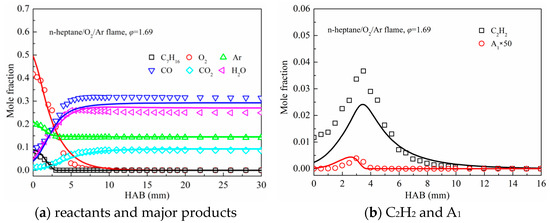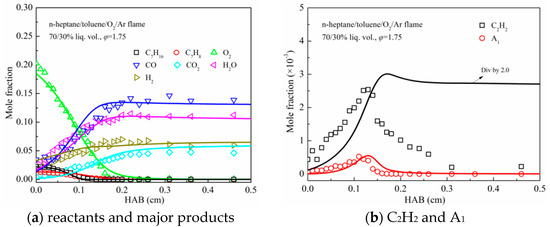 Knyazkov et al. [46] investigated the speciation data for a premixed fuel-rich (φ = 1.75) atmospheric pressure n-heptane/toluene mixture (70%:30% by liquid volume) flame by employing molecular beam mass spectrometry. As shown in Figure 8, the proposed mechanism’s simulated species concentrations of n-heptane/toluene flame are compared with that of experimental data of reactants, major combustion products and two intermediate species. It is evident from Figure 8a that the proposed mechanism can well reproduce the experimental data of n-heptane, toluene, O2 and major products (CO, CO2, H2 and H2O). In addition, the present mechanism satisfactorily predicts the A1 molecule mole fraction (see Figure 8b), but the experimental data of the C2H2 mole fraction are not reasonably predicted by the present mechanism. The peak value of the C2H2 mole concentrations is obviously overpredicted. Meanwhile, the present mechanism significantly overpredicts the C2H2 mole concentration in the post-flame zone compared to the experimental data; similar results were also obtained by Knyazkov et al. [46]. This discrepancy may be due to the lack of some important combustion chemistry of C2H2 species in the present mechanism.