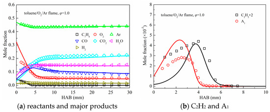 An experiment on low-pressure (4.0 kPa) premixed toluene/O2/Ar flames for φ = 1.0 and 1.75 was carried out by Li et al. [45], and the species concentration profiles in the two toluene flames were determined by using synchrotron vacuum ultraviolet photoionization mass spectrometry. Experimental data from Li et al. [45] were also taken to assess the performance of the proposed mechanism. Figure 7 presents the measured and predicted mole fraction profiles of reactants, major products (CO, CO2, H2 and H2O) and two selected intermediate species in premixed toluene flames. The results revealed that the present mechanism’s simulated species concentrations of reactants and major products meet the experimental results quite well. Furthermore, the proposed mechanism can correctly capture the variation trends of two intermediates (C2H2 and A1), but some disagreements between simulations and experiments are observed below 3 mm above the burner.