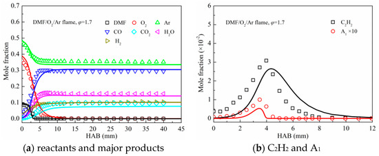 Togbé et al. [47] investigated a premixed fuel-rich (φ = 1.7) DMF/O2/Ar flame at low pressure (40 mbar), and the species concentration profiles were detected using gas chromatography. In Figure 9, the measured major species—C2H2 and A1—profiles in a DMF premixed flame are compared with those predictions by the proposed mechanism. As observed from Figure 9, the predictions of reactants, CO, H2O and H2 agree well with the experimental values. Moreover, the proposed mechanism offers a good description for the C2H2 mole fraction, although the prediction is slightly shifted towards the high height of the burner. However, the predicted CO2 and A1 profiles are slightly lower than the experimental data, which may be caused by the simplification of the proposed mechanism; such discrepancy can also be found in the work of Togbé et al. [47]. Overall, the predictions of species concentration profiles in the DMF premixed flame are in good agreement with experimental results.