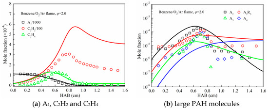 Measured [48] (symbols) and predicted (lines) species profiles in the premixed benzene flame with φ = 2.0.
