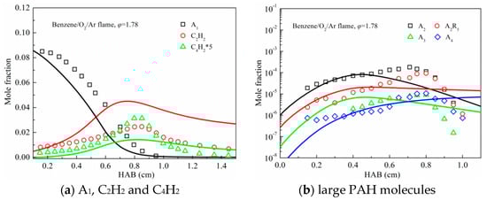 Measured [49] (symbols) and predicted (lines) species profiles in the premixed benzene flame with φ = 1.78.