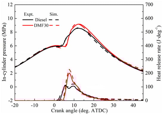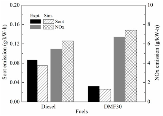Figure 14 displays the simulated results of soot and NOx emissions using the present mechanism against the experiments. As seen, both simulated and experimental data indicate that the soot emission level of diesel is obviously higher than DMF30 as there is more carbon content and less oxygen content in the diesel fuel, while DMF30 produces more NOx emissions compared with diesel due to the enhanced premixed combustion, which is consistent with other studies [14,23]. In general, the predicted soot and NOx emissions are fairly close to the experimental data, considering the existing experimental error and the size of the proposed mechanism.