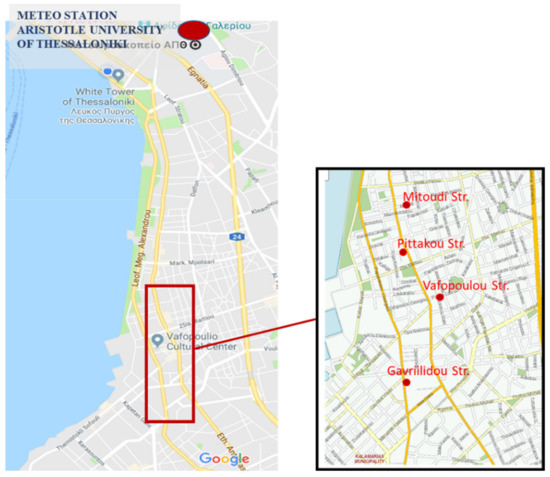 Relative locations of the selected urban districts and the reference location of the meteorological station on the Aristotle University campus.