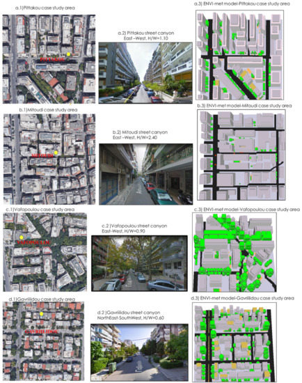Google Earth images of the selected urban districts and indication of the onsite measurements spot (a.1–d.1), cross-section of the street canyons where the building units, the energy needs of which are to be assessed, are located and an indication of their orientation and H/W ratio (a.2–d.2) and the 3D ENVI-met area input files of the case study areas (a.3–d.3).