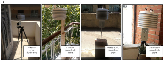 The different mounting procedures of the loggers at each one of the respective study areas are shown in Figure 4, whereas the locations of the loggers are shown in Figure 2a.1–d.1 (yellow spot). In the Pittakou and Gavriilidou study areas, the radiation shields were mounted on tripods, while in the Mitoudi and Vafopoulou case study areas, they were mounted on vertical flat rigid surfaces, fixed accordingly to remain stable. To eliminate potential boundary effects formed along the building walls, the radiation shields were placed at a minimum distance of 60.0 cm from the exterior building walls.