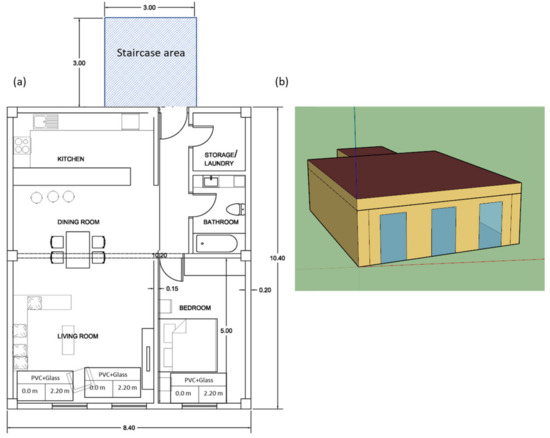 In this study, a total of 16 EnergyPlus simulations were conducted for each one of the four case study areas. The energy performance of the building units of the 1st and 3rd floor was simulated using (a) the reference weather dataset (RWD), that could be theoretically used for every site in the city of Thessaloniki (1st run) and (b) the corresponding site-specific weather dataset (i.e., the generated USWDs), reflecting the climatic conditions in the vicinity of the examined building unit (2nd run). All simulations were performed for the existing building envelopes, in which there is no thermal insulation. A plan of the assumed building unit with a total surface area of 90 m2 and the respective 3D model introduced into the EnergyPlus tool are depicted in Figure 6. The generic apartment is designed as a single thermal zone and it is surrounded by other neighboring apartments on the same floor, while the staircase area is assumed to be an unconditioned thermal zone (no thermostatic control). The main façade of the building unit is exposed to the exterior conditions, while the vertical façade separating the apartment from the staircase is exposed to an unconditioned thermal zone. The floor, ceiling and the rest of the vertical facades of the apartment are considered as adiabatic due to the same operational schedules between apartments.
