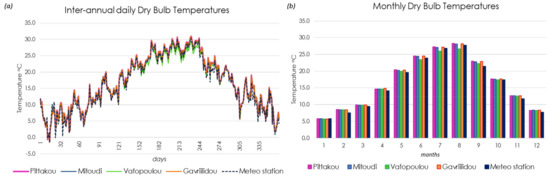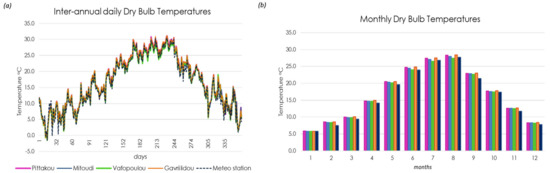 Moreover, the Tair values at the reference location of the meteorological station are generally lower compared to those found for the urban areas. For the heating period, the maximum deviations were noted in February, when the monthly Tair values in front of the 3rd floor building unit in Pittakou, Mitoudi and Gavriilidou area are 1.0 °C, 0.90 °C and 0.95 °C higher than the Tair at the meteorological station (i.e., 13.0%, 12.0% and 12.6% higher). On the other hand, in August, the Tair values near the building units in Pittakou and Gavriilidou canyons are almost 2% higher than the corresponding reference value (i.e., close to 0.50 °C higher), whereas in Mitoudi canyon, the estimated deviation from the Tair of the meteorological station is slightly lower (i.e., 0.37 °C).