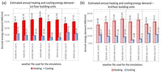 Estimated annual heating and cooling energy demands using the RWD and the USWDS for (a) the examined 1st floor building units and (b) the 3rd floor building units.
