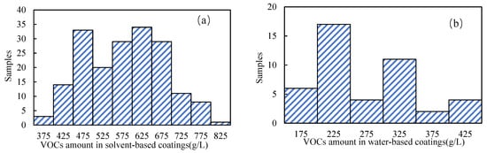 Distribution of VOCs content in solvent-based (a) and water-based (b) coating samples.
